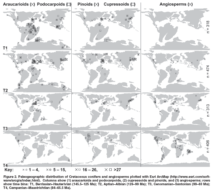 What did they find? The figure below is a summary of those results. In the early Cretaceous (oldest rock, deepest rock of that time period) the types of wood found on all of the continents of the time were exclusively conifer types especially of a type of conifer that is only found in the southern hemisphere today (the Araucaroiods – see picture). Time periods T1 through T4 on the figure below represent rock layers that are above each other and represent younger and younger rock (see legend for dates).