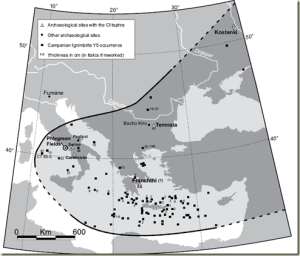 How can such “absolute” markers be used to help us understand migration and community development in humans? Since this ash layer is found over all of Greece, Turkey, Most of Italy and up into Russia any remains of humans or any other organism in a cave or other deposit can be identified as having been deposited either before or after this super-volcanic explosion in Italy. This is similar to what we saw in the Toba super eruption in Indonesia which spread a thick layer of ash over much of India. Human artifacts and fossils have been found well below and up to the ash layer strongly suggesting the presence of humans there prior to the volcanic explosion. In the case of the Campanian Ignimbrite (CI), which is what the ash from this super-volcano is called, Lowe et al. (2012) found that by comparing many sites with humans remains in southern Europe that this ash layer falls in the period when there are both