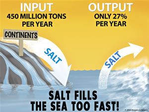 …..One of the strongest arguments for a young age of the earth is the amount of salt1 found in the oceans. If the world were billions of years old as the evolutionists and progressive creationists insist, there should be so much salt in the oceans that virtually nothing could survive in the enormous amount of salinity.