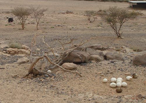 Female ostriches will lay eggs in a dirt nest that has been prepared by the male ostrich. Multiple females will use the same nest but typically the last female to lay eggs is the dominant female and she will roll and kick many or all of the previously-laid eggs out of the nest (see picture). This has the effect of insuring that only the dominant females genes will be passed down to the next generation. The female and male will periodically take turns incubating the primary eggs with no attention paid to the surrounding eggs. Among the eggs that are incubated, many are lost or broken in the dirt nest. Even after hatching, it is the male ostrich that will take care of the young of which only 15% typically will survive to reproductive age with the others becoming prey to a number of predators. Despite these difficult survival odds , ostriches are long-lived birds allowing them 20-40 years to attempt to produce offspring. Therefore even if only 15% of offspring reach maturity, dominant ostriches may have many offspring that survive to the next generation.