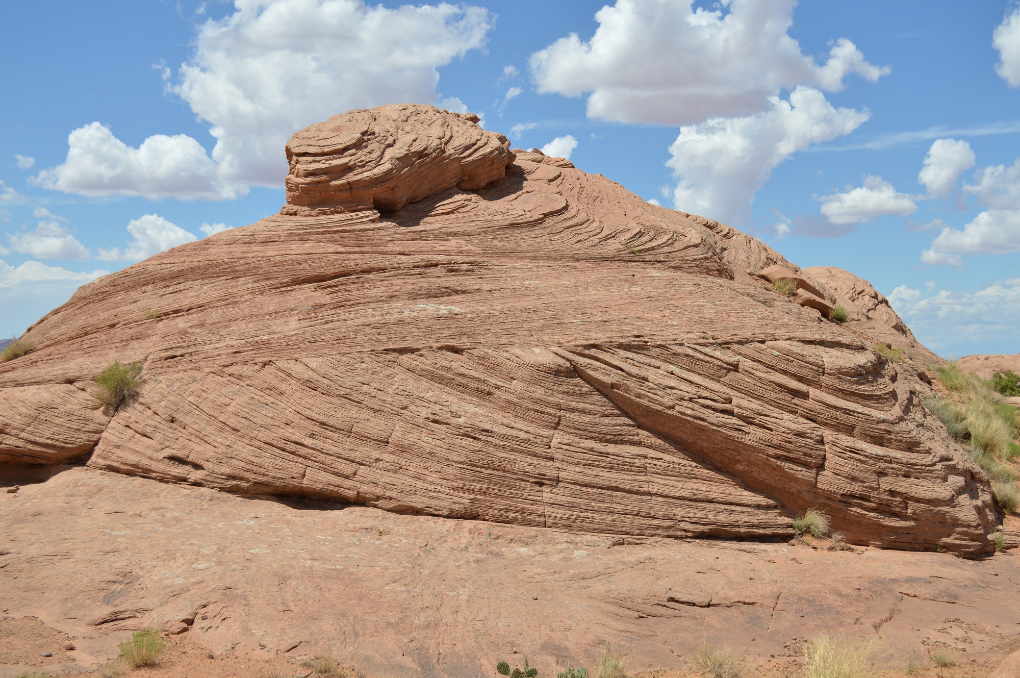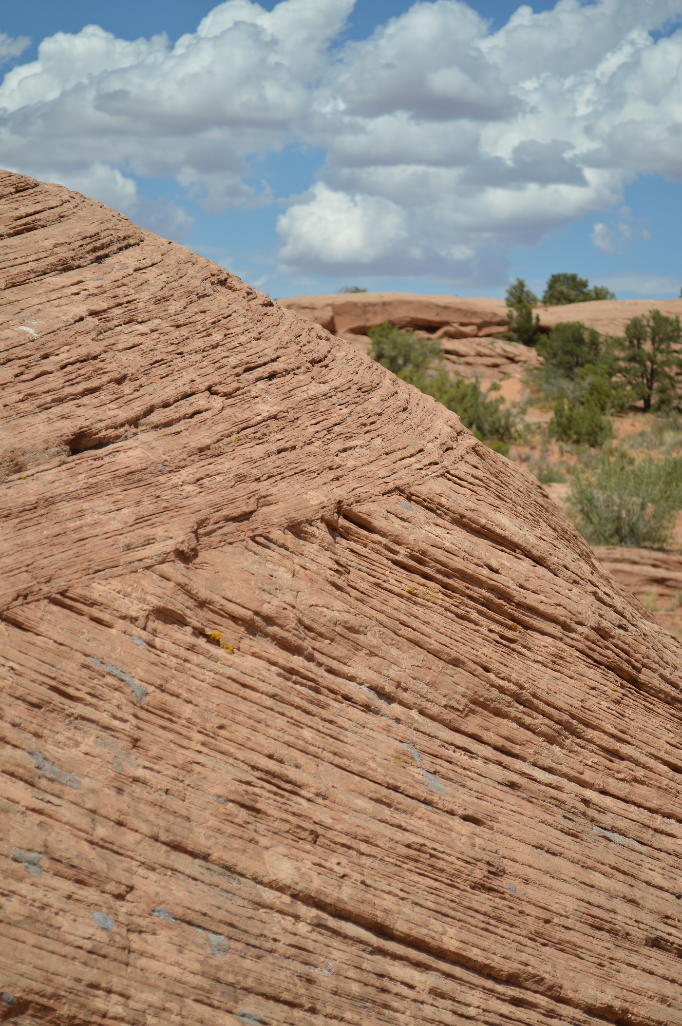 The image above is one of my favorite pictures of a rock that I took while in the Moab region.   This mound was right by the side of the road and I thought captured the characteristics that I was seeing in the sandstone rocks formations of the area.   The man layers of sand are obviously sloping in different directions. You can look at this and just imagine a sand dune being eroded partly and then a new sand dune moving along from a different direction and piling on top of the old dune.   These formations are difficult to image having been formed under water, especially when the types of fossils found rarely in them suggest a terrestrial formation.   The current background I am using for the blog is from a similar formation found in Zion National Park and shows the same sort of layers that meet and different angles.