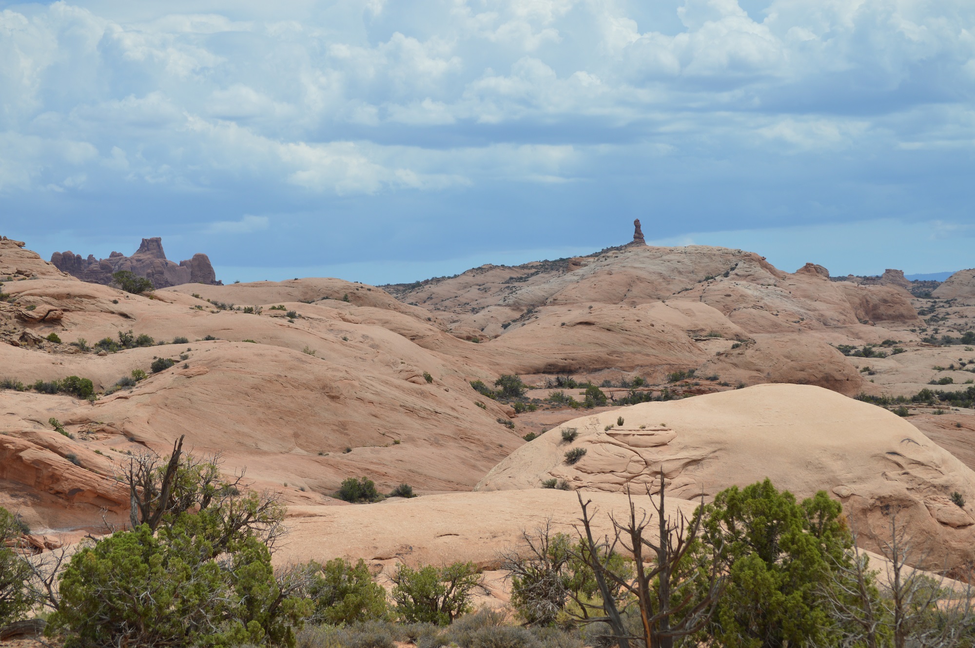 Just above Moab UT to the east is a famous mountain biking and 4×4 area called the slickrock region.  The slickrocks are in fact, petrified sand dunes (sand dunes that have solidified into rock) which have been revealed when the material above them eroded.  Above is a picture of some of the slickrocks looking toward the north.   In the far distance some of you might be able to see the heads of the Three Gossips formation or Courthouse Rock in Arches National Park.