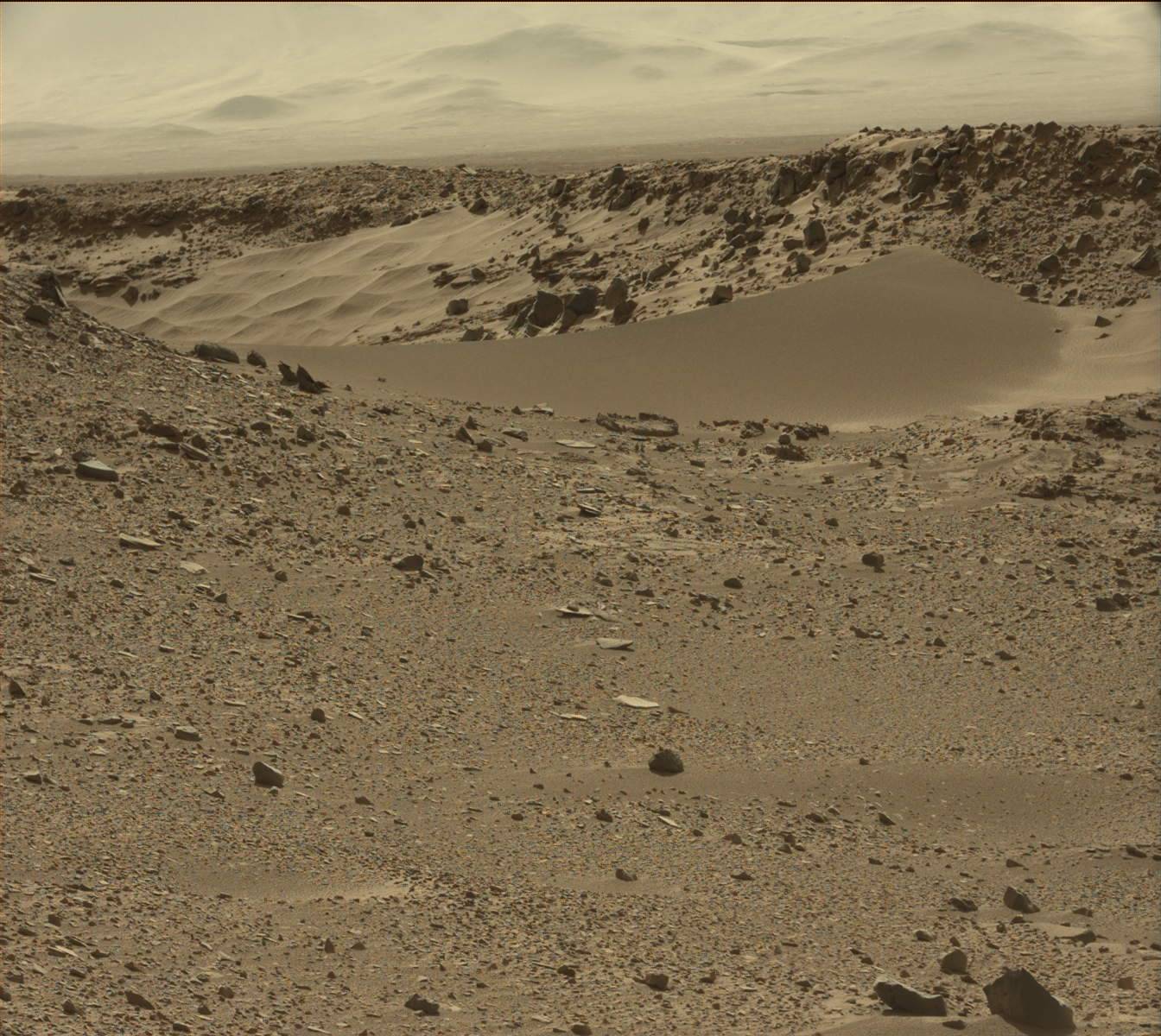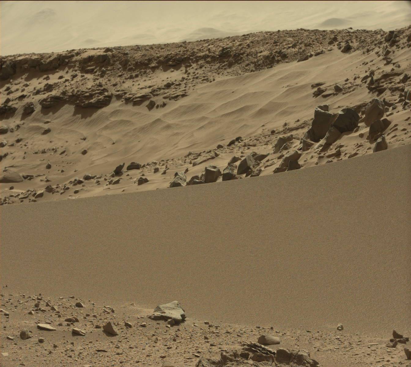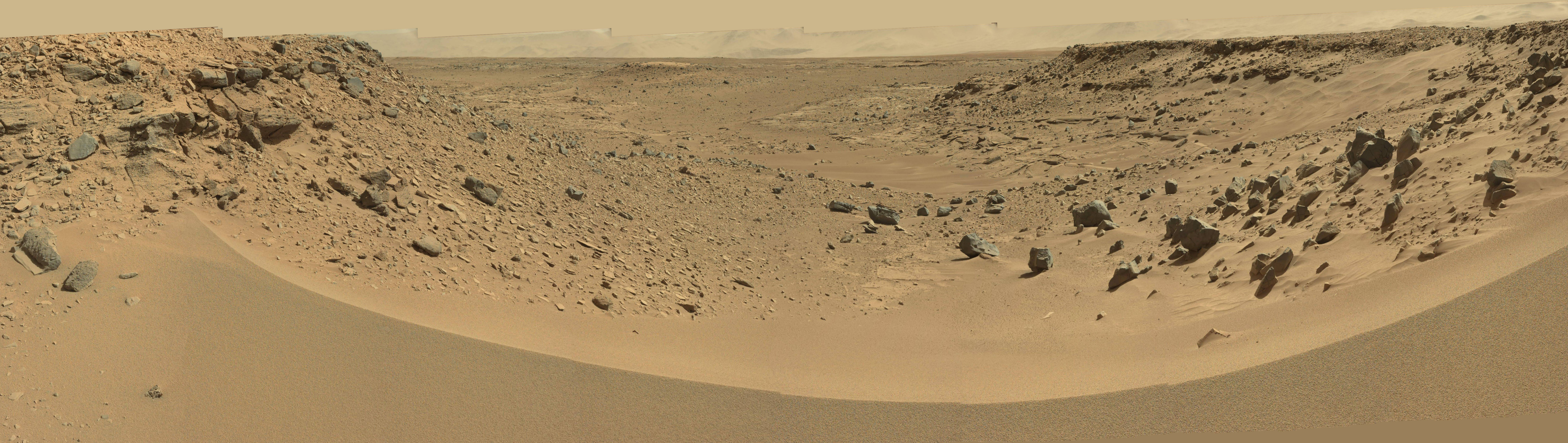When I last updated you on the excursion that the Curiosity rover has been making across the floor of Gale Crater on Mars I noted that the images it has been beaming back had been getting rather routine. But the rover has slowly been moving downhill toward what seems more and more likely to have been the location where a large lake once was. Along the way some more stream and river sediments have been observed but now it has arrived at an area that is certainly the most interesting and Earth-like yet seen by Curiosity so far. The martian air has also cleared in recent weeks allowing the walls of the massive Gale Crater to be more clearly seen looming in the horizon.