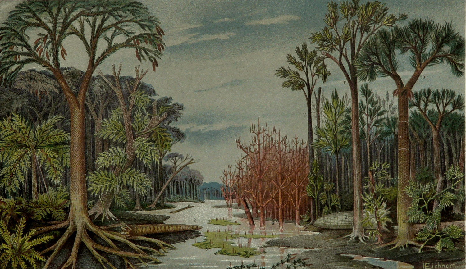 1800s lithograph (unknown source) of the flora of the Jurassic. Notice the lack of flowing plants. Most of these plant are extinct today. Also not the lack of grass which is a flowering plant but did not exist in the Jurassic.