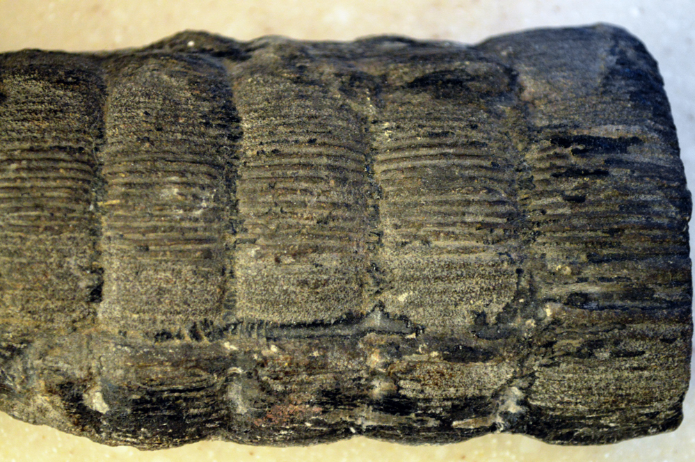 Orthoceras is an extinct group of nautiloid cephalopods with linear shells. They were highly abundant in all oceans of the Devonian and up into the lower Ordovician time periods. after that they went extinct but they left billions of shells in fine sediments that have turned into a form of marble. Below are sheets of that marble from Morocco where you can see how abundant these fossils can be. In the case of my fossil above, someone has carved the marble such that they have highlighted a few large Orthoceras fossils. You can see the inner chambers very clearly.