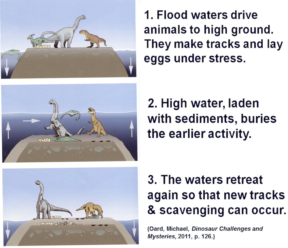 Contrast the considerable data from multiple sources that point to an ancient landscape dotted with lakes, rivers, dinosaurs and other reptiles to the scenario imagined by young earth creationists. The image to the right portrays their general hypothesis for trace fossils in the geological column. It goes something like this: after the onset of a catastrophic flood and after 10s of thousands of feet of sediments had already been deposited in a few short weeks or months, dinosaurs that had managed to survive this cataclysm drug themselves up on top of mounds of fresh sediments. Congregating in high places – I am unclear how these high places were formed or where the dinosaurs were while these places formed – they made tracks in fresh mud only to find that the flood waters rose once again to cover them over. The dinosaurs all died, except representatives on the ark, but their tracks – and nests, and feces – were preserved. The flood waters then continued to deposit thousands of new layers of sediments on top of these sediments. Most of that sediment was then washed away as the flood waters retreated leaving the canyons and valleys we see today in Utah.