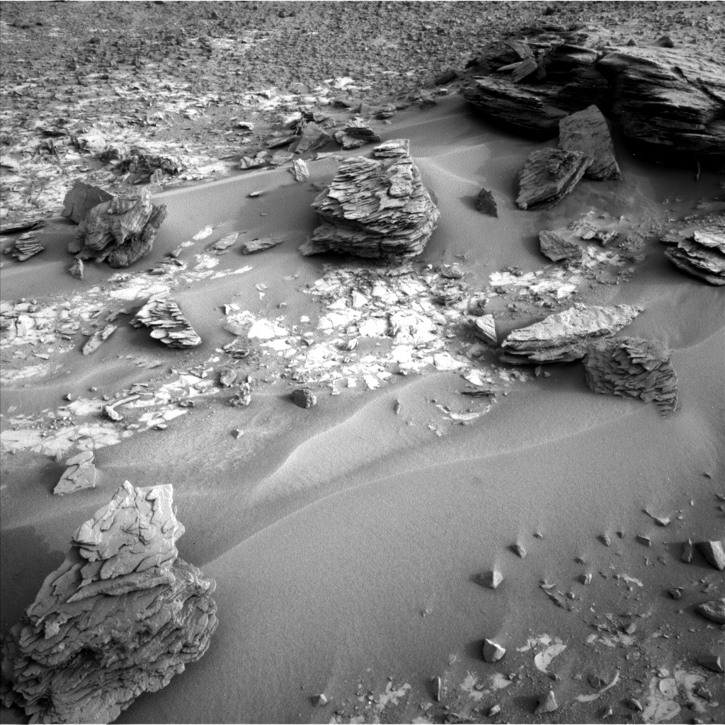 On a windswept layer of rocks in a basin surrounded by small cliffs are some fantastically eroded remnants of thinly bedded sedimentary rocks. It isn’t clear if these sediments were laid down in water or by wind but Curiosity has confirmed that the rocks have been soaked in water at some point during their lives.