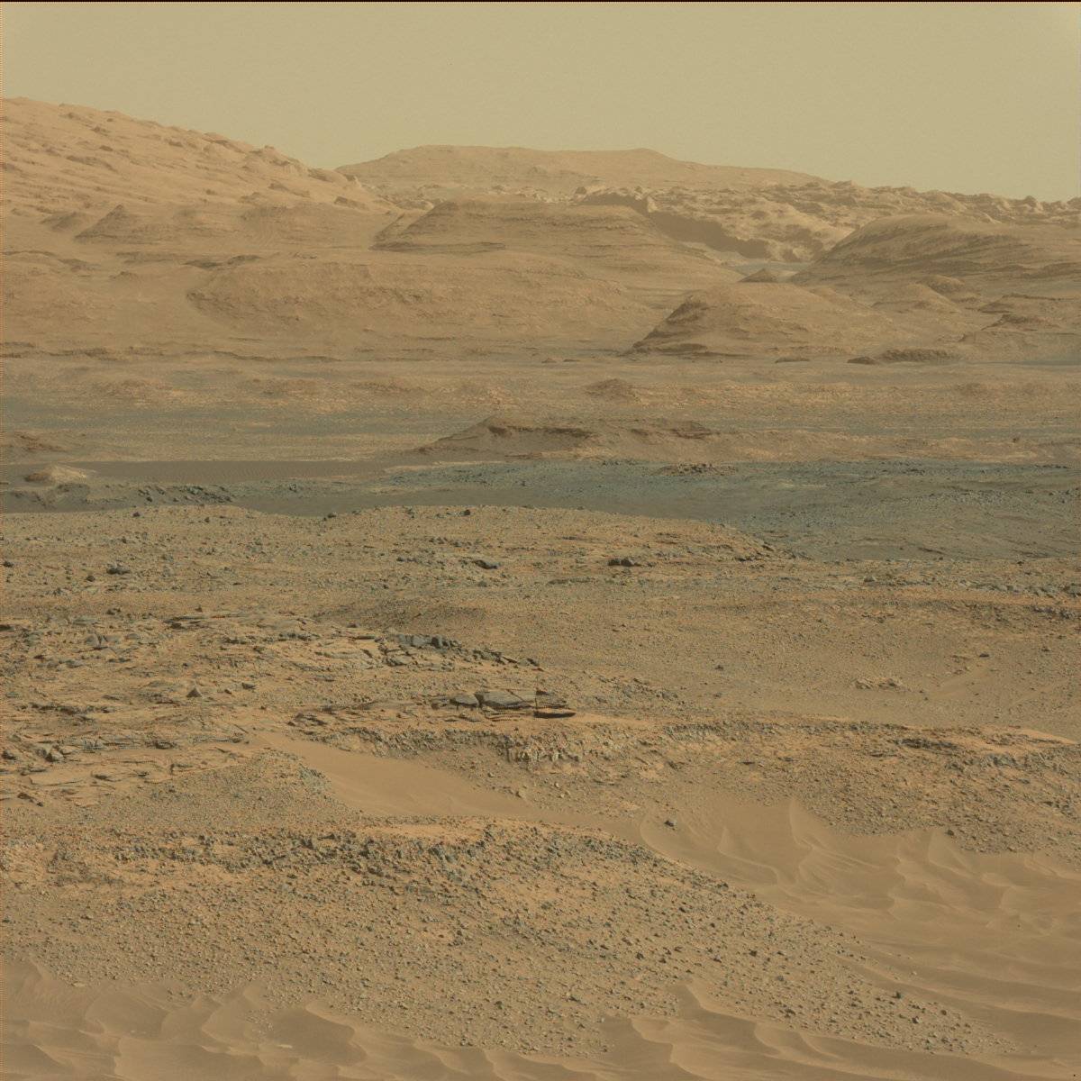 Looking out to where the rover will travel next. The goal is the hills way off in the distance. To get there, Curiosity will have to traverse a region of small valleys and sand dunes. It should be an interesting trip.