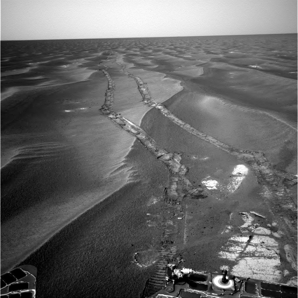 To get some perspective on the size of the sand dunes the picture below shows the rovers tracks. The rover itself is about the size of a riding mower. Some of the sand dunes that it came upon later were larger and at one point the rover got stuck in a dune for several days.
