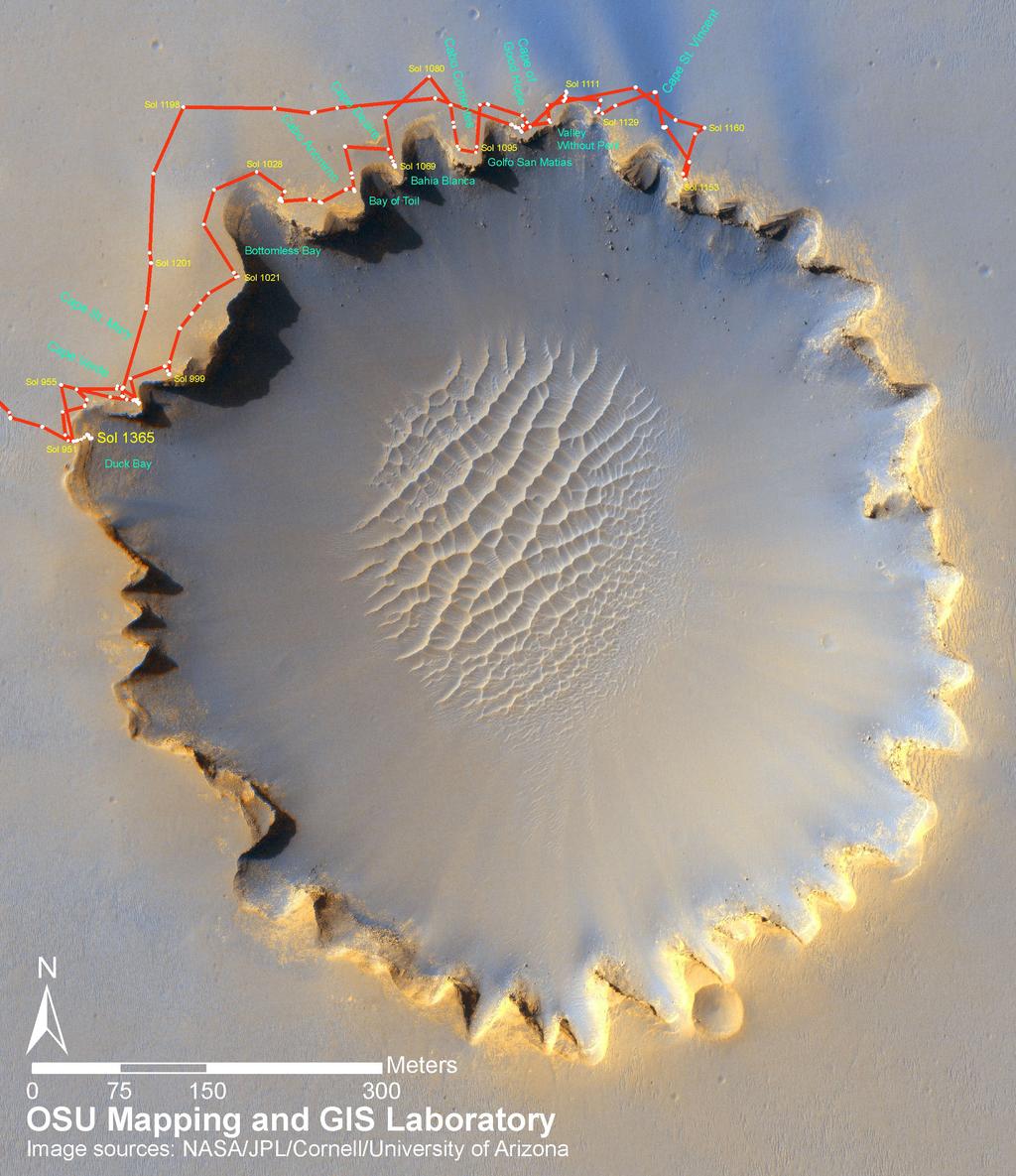 More than a year later Opportunity had driven to another crater (Victoria) which is more than twice the size of Endurance.