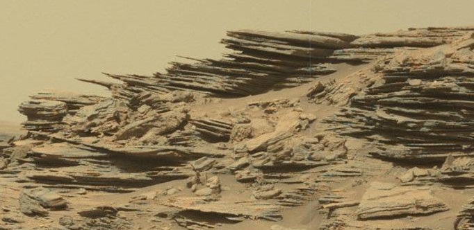 I have zoomed in on one section of this rock outcrop to show you the complex pattern of erosion that has taken place. These thin slabs of rock projecting into the thin martian air are less than one inch thick.