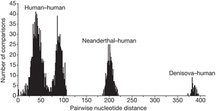2) The Neanderthal and Denisovan sequences are more different from any living human than any living human is from one another. However, even this amount of difference is less than is found in other closely related species or even among chimpanzees of the same species. This is why Neanderthals are considered to be a separate branch and yet still very closely related to modern man (sometimes considered a subspecies or variety). See the graphic below to get some sense of the differences of these hominid and modern human sequences. This shows that Neanderthals and any person alive today will have about 200 differences in their mtDNA genomes whereas any two humans alive today only differ by a maximum of 100 differences.