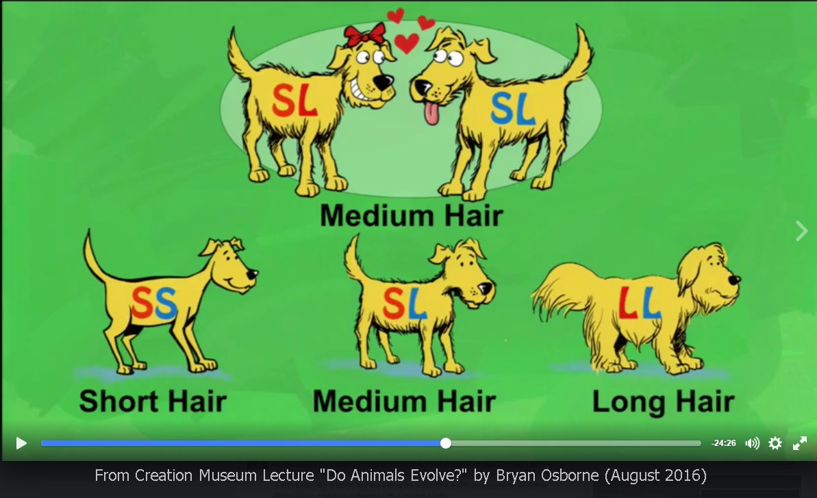 This is a central thesis of the young-earth view of biological change over time. Kinds can’t become other kinds. And one of the reasons is that they believe new information must be created for this to happen. In this particular part of the talk, that point is rather irrelevant. Here we learn from Osborne that evolution of kinds can’t happen because no new genetic information is added by natural selection. He is right, natural selection does not add new variation to an organism. Osborne made this sound like it was a big revelation but this was already true. Natural selection does not create variation. Natural selection is one mechanism which may cause one particular variation to become more or less frequent in future generation. Osborne can’t get excited about natural selection being unable to do something that modern evolutionary theory doesn’t claim it can do in the first place.