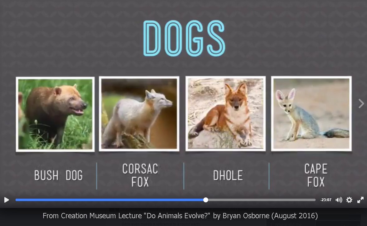 After showing how some traits can be selected for by natural selection Osborne proceeded to show multiple domestic dogs and say they are all still dogs. The implication was that we know that these domestic dogs were all created by selection on ancestral wolves and thus natural selection really does work and can change animals – within limits of course. But then he proceeds to show multiple canine and fox (vulpine) species. He equates the changes that made domestic dogs with how all of these species could have easily have been formed since departing Noah’s Ark.