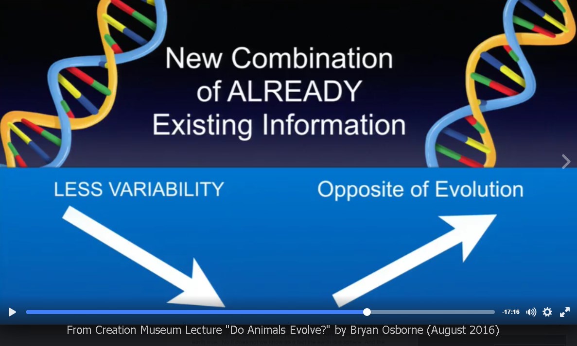 Here is the big picture: The variation in all species today already existed from the beginning and so natural selection is nothing but a fancy genetic sorting machine that eventually causes the loss of information. Mutations are all bad and so they cause nothing but the decay of information over time. Osborne claims that evolution requires the opposite and therefore can’t happen.