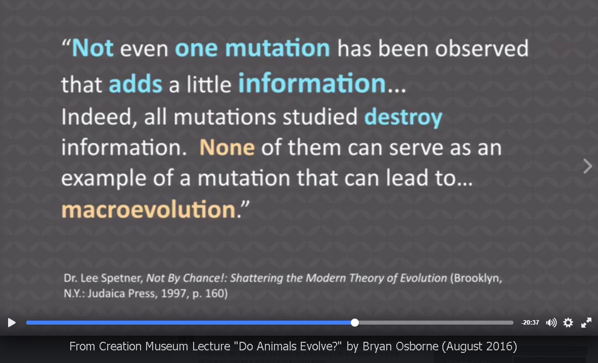Here is another quote that Osborne introduced with “this secularist scientists says, no” referencing the question of whether information can be gained by mutations. Who do you think the YEC audience thinks Dr. Spetner is? They probably think he is the average atheistic evolutionists and represents the conventional evolutionary thinking. But here again we have Osborne using quotes from people who in no way represent the general evolutionary biology community. Dr. Spenter has been called the Jewish creationist and so I am not sure calling him a secularist is correct. He is no friend of conventional evolutionary biology though he has his own ideas of how organisms can change by directed mutation. So it is not surprising that since he thinks mutations are directed by design that he would be critical of random mutations as a mechanism of introducing variation into organisms. His definition of mutation would differ from what either an evolutionist or YEC might use. So, I am not sure how this quote furthers Osborne’s point but his YEC audience doesn’t know that this quote doesn’t really carry any weight. Honestly, I doubt that Osborne knows this is the case either since he probably gathered his info from other YEC books or had this portion of the talk written for him.