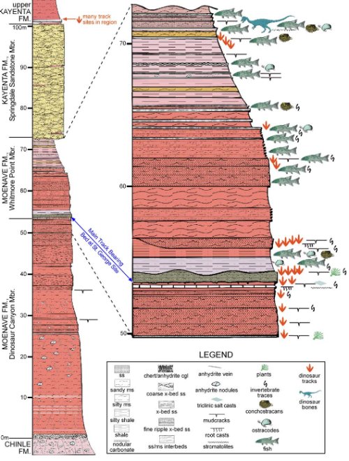 A section of the geological column from southwestern Utah showing that dinosaur tracks and found in may layers of rock presumably laid down in the middle of Noah’s flood. Figure 2 from the paper: Stratigraphic section of the Moenave Formation at the St. George Dinosaur Discovery Site at Johnson Farm. Resting trace and trackway SGDS.18.T1 is in the “Top Surface” of the Main Track-Bearing Sandstone Bed (indicated by the blue arrow) in the Whitmore Point Member of the Moenave Formation. From: http://scienceblogs.com/gregladen/2009/03/10/a-most-amazing-set-of-spoor/