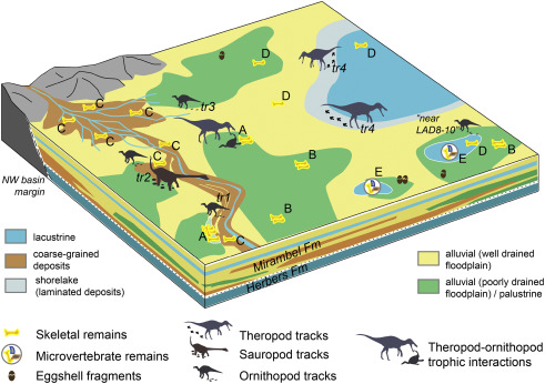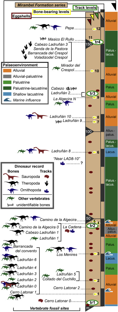 Fig 4 from Gasca et al. 2017. Their fig legend: Synthesis of the vertebrate fossil record of the Mirambel Formation in the Ladruñán anticline, showing the vertical distribution of tracksites, bone-bearing sites, eggshell occurrences and palaeoenvironments.