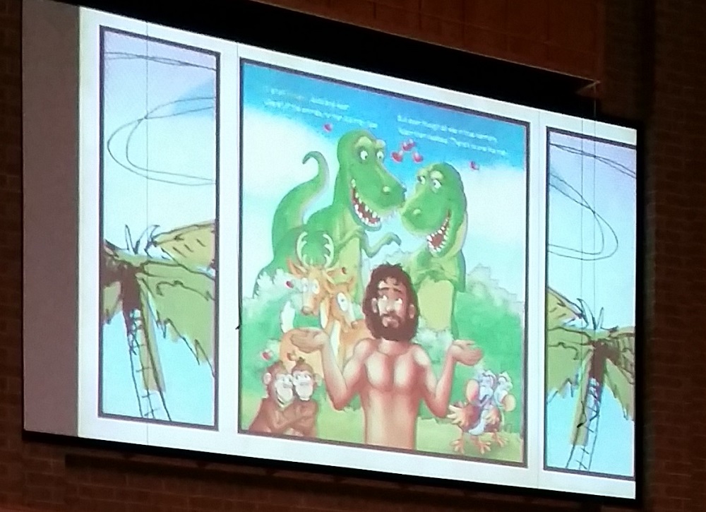 1. I like how Adam has his hands up in that first slide. It’s like the YEC view of creation is the script to an 80s sitcom. “He’s a dinosaur – he’s a man / They’re living together / It’s all part of the Plan”