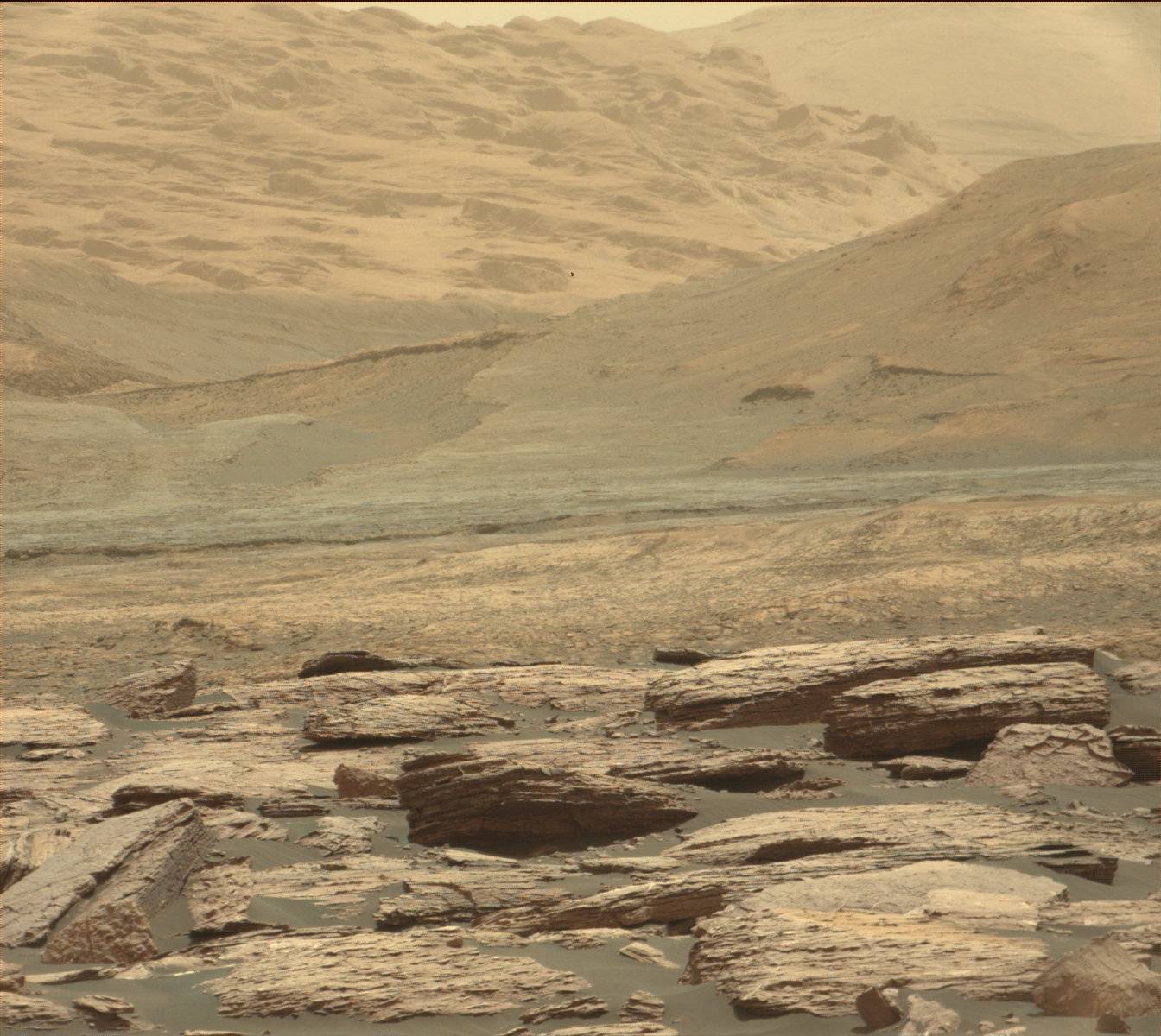 A view from the lower levels of Gale Crater looking toward the mountains that exist in the center of the crater. The rocks here are thinly layered sedimentary rocks. Out of view are hills that contain thousands of thin layers of rock either laid down by water or wind. In the past these rocks would have covered the location that the rover was standing at the time it took its picture. Photo: NASA-CalTech/JPL 1516MR0077190000204658E01