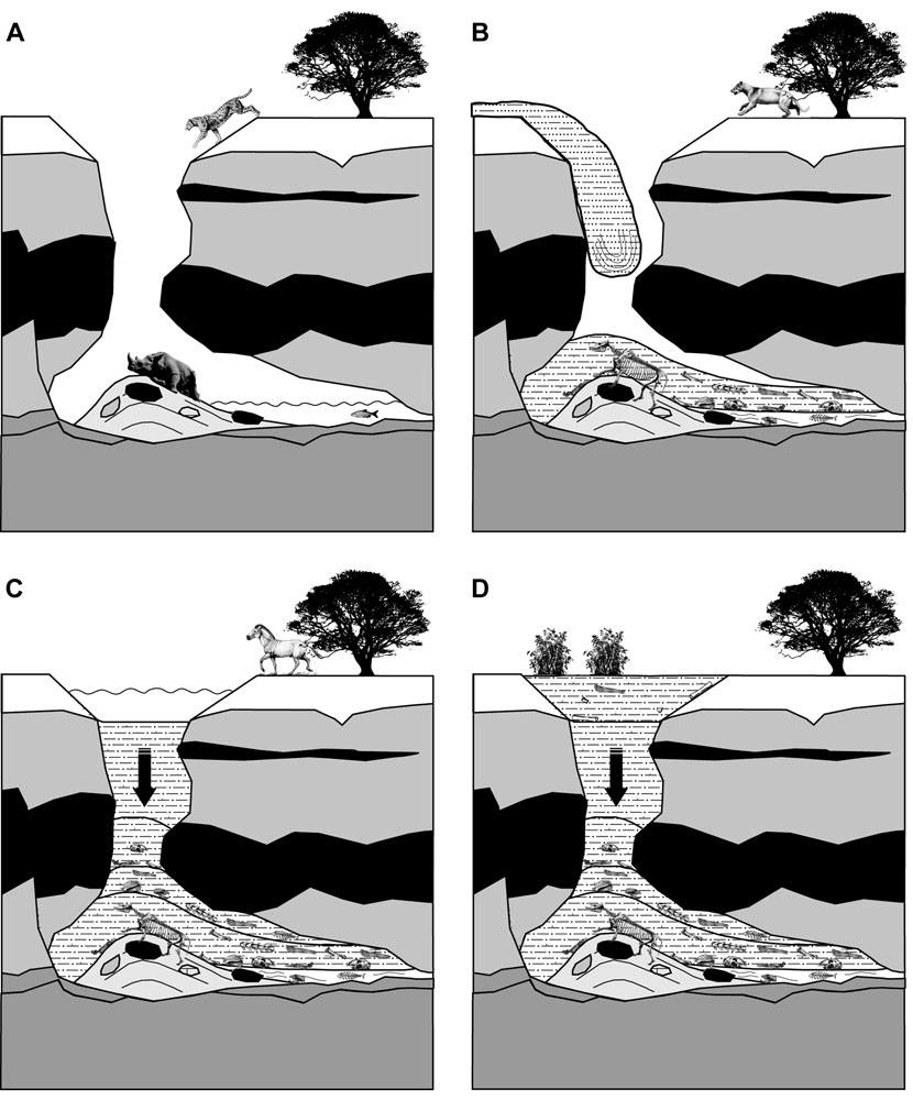 A figure from the supplements of the reference in this post. This is a diagram of a possible history of this cave/pit from the time it formed to its being completely filled.