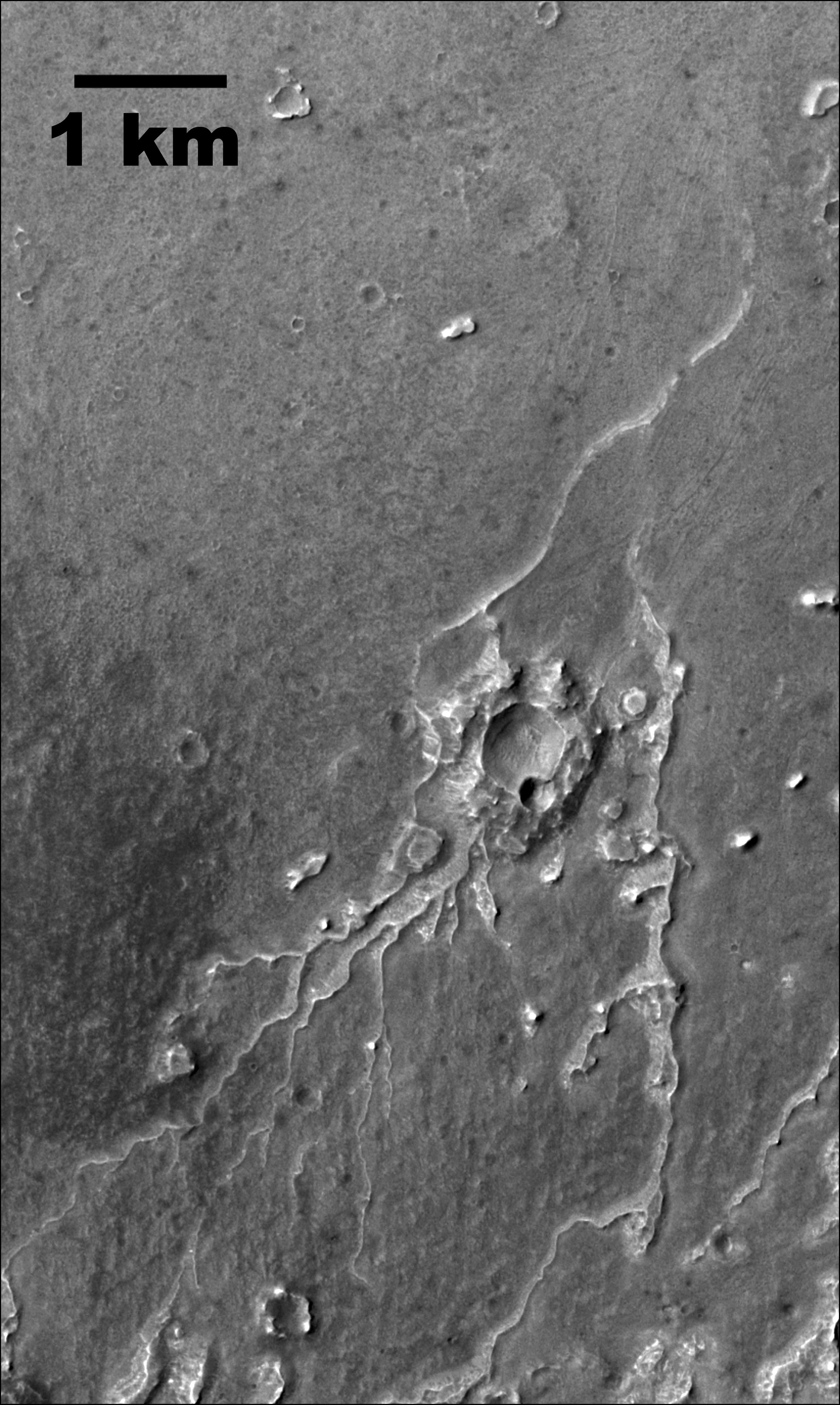 An inverted ancient river on Mars?  Subscene of CTX image P01_001377_1887_XN_08N076W_061111 of branching ridge network located on Lunae Planum. The dendritic pattern, low junction angles, as well as the number and spacing of low order tributaries are all evidence of a fluvial origin to the landform..