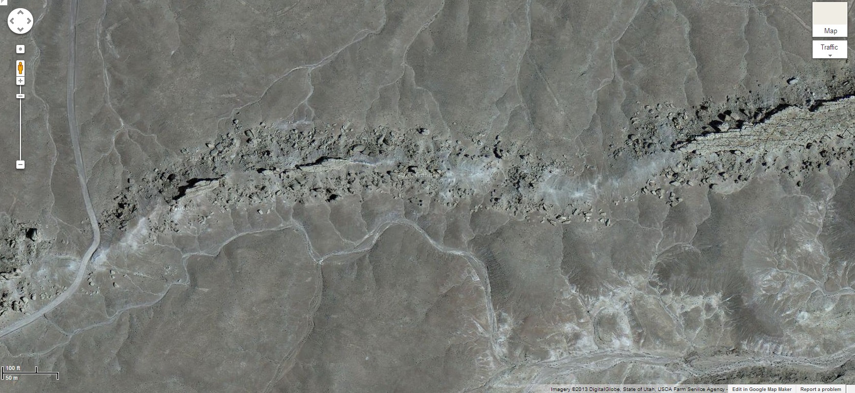 Inverted/raised paleochannel as seen on Google maps. in this close-up you can see the hardened rocks of what used to be the stream channel that are now about 100 feet above the surrounding landscape.