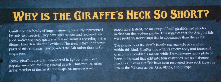 The Ark Encounter theme park in Kentucky is filled with signs and displays that promote young-earth interpretations of geology, astronomy, biology, archaeology and theology. I have critiqued many of these interpretations before (e.g. My Trip to the Ark Encounter and Depicting a Real Flood with Unrealistic Images). Today, I want to talk about one sign. A sign that explains the young-earth understanding of the origin of giraffes.