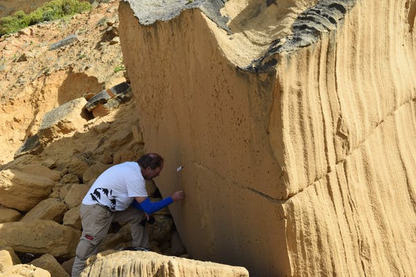 Author Martin Lockley working on the surface that contained seven sub-parallel hatchling loggerheard turtle trackways.  Notice the vertical lines on the right side of the sandstone block. These represent the original layers of beach sand that were laid down horizontally.  Photo from an article in TheConversation (see references).  Photo by author Charles Helm