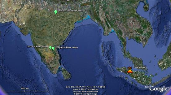Petraglia, M.P., Korisettar, R., Boivin, N., Clarkson, C., Ditchfield, P., Jones, S., Koshy, J., Lahr, M., Oppenheimer, C., Pyle, D., Roberts, R., Schwenninger, J.L., Arnold, L., and White, K., 2007, Middle paleolithic assemblages from the Indian subcontinent before and after the Toba super-eruption, Science, 317, 114-116.
