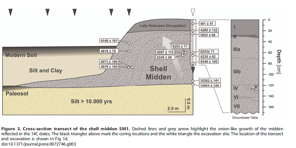How old are these mounds of shells and bones? Data collected from these mounds gives us some clues. Cores into the mounds were dated from top to bottom and it was found that the oldest material on the bottom dated to around 10,000 years ago. I’ve written a series of posts about how context is key to understanding chronology of human remains (See The frequently overlooked geological context of hominid fossils and Implications of artifacts and bones on ancient human butchery practices and Geological context II: Neanderthals and the Italian supervolcano. Context is no less important here either when one considers how old these mounds must be.