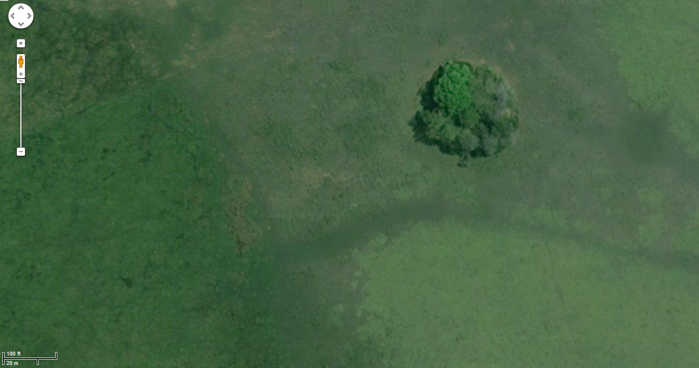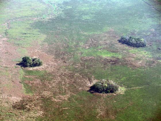 The Amazon basin isn’t all a lush tropical forest. In large portions of western Amazonian wet seasonally flooded grasslands–not trees–are the norm. The upper branches of the Amazon River wind themselves across massive flood plains like snakes writhing across a sandy surface. One feature of these nearly featureless flat plains that has long puzzled visitors is the presence of hundreds of small forest islands. These 50 to 200-foot diameter forest islands found amongst seas of grass and marshes sit only one to three feet above the surrounding ground level. That small elevation change is enough to reduce the water content of the soil allowing trees to persist on these mounds.