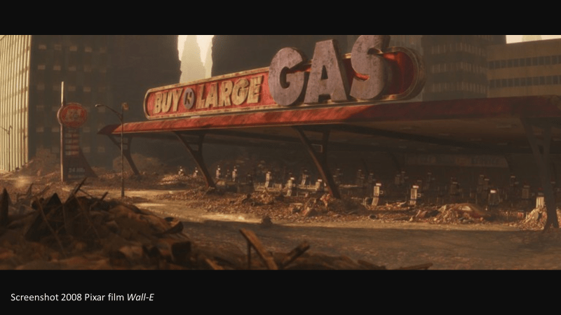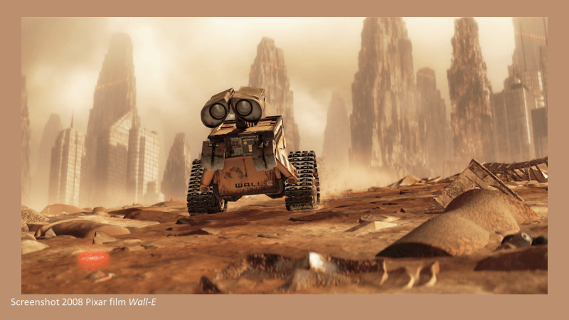 During the first 20 minutes of dialogue-free scenes we meet Wall-E against a post-apocalyptic scene. The earth has been devastated, it is a garbage-strewn wasteland due to apparent rampant consumerism and corporate greed that took place hundreds of years earlier. We will find out later that man has abandoned the earth to live on ships among the stars while they await the possible renewal of their home.