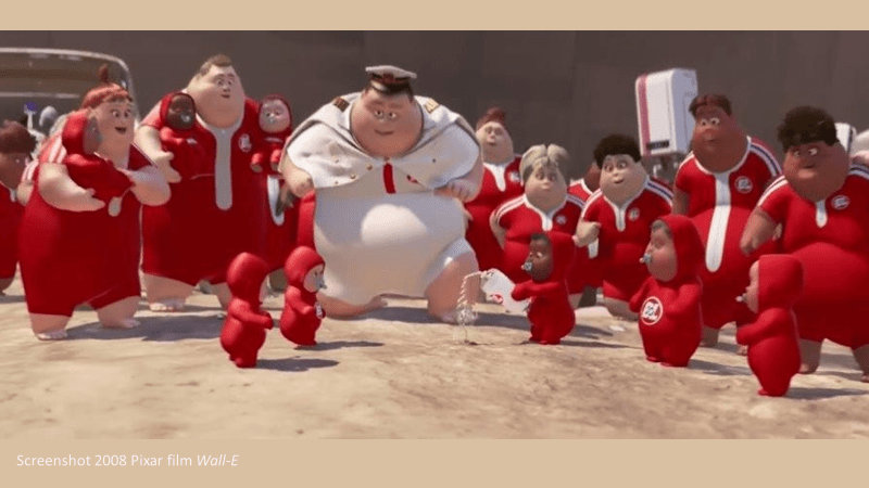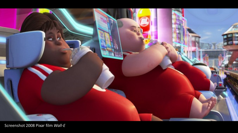 Eventually EVE and Wall-E are transported into space to the ship where the remnant of the human race has been biding their time while the earth is cleaned up. But hundreds of years have gone by. The people are living on a ship named the Axiom. This name means a thing that is self-evidently true so, maybe, we will see what is true about the human condition here in the ship. We quickly discover that the Axiom population has grown complacent. There is NO work here. They are served by computers and do nothing but participate in activities that are self-satisfying.