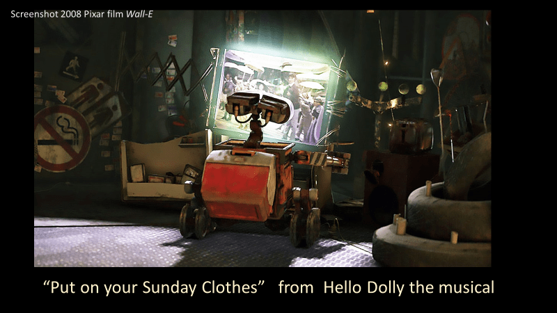 Here we see Wall-E during some downtime watching a videotape that he found among the rubble. The clip is from the 1969 musical “Hello Dolly.” The scene he watches includes a song from that musical “Put on your Sunday Clothes”. It’s a song we hear repeated several times throughout the movie.