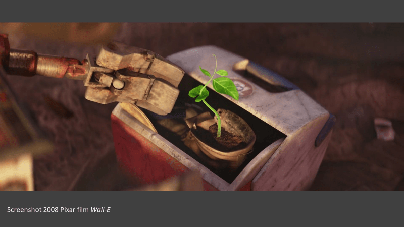 I want to stop and consider how this plant is portrayed because it is crucial to the message of the movie. The plant is growing out of a dirty old shoe. Again, I don’t believe it was an arbitrary choice by the screen writer and director of this movie. A garden theme is being drawn out for us. The plant conjures up the idea of a garden, of a place that will provide food from the ground. Having this first plant on earth in a shoe reminds us as viewers that this future will require work. The labor of man will be necessary to tend this small plant and bring it to the stage of bearing fruit.