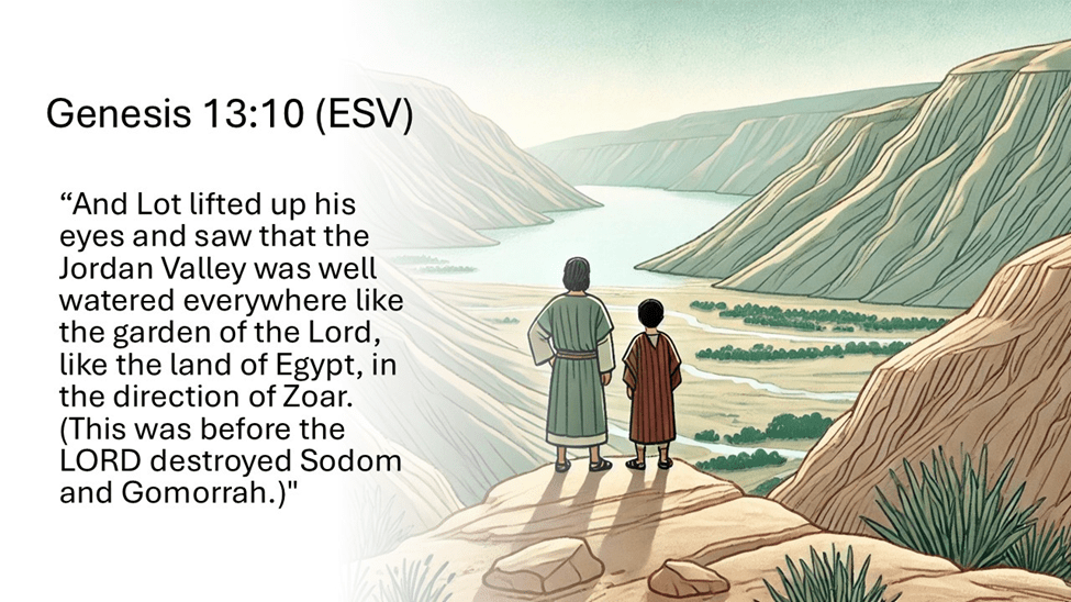 In Genesis 13:10 (ESV), we read: “And Lot lifted up his eyes and saw that the Jordan Valley was well watered everywhere like the garden of the Lord, like the land of Egypt, in the direction of Zoar. (This was before the LORD destroyed Sodom and Gomorrah.)” This description suggests that around 4000 years ago, the Dead Sea and its surroundings were not dramatically different from what we see today in terms of general layout, though perhaps with somewhat more abundant water (Frumkin and Elitzur, 2002). We should note here that the “well-watered” in Biblical times likely doesn’t refer to abundant rainfall but rather the presence of reliable springs and streams used for irrigation for crops. This is true of the Jordan Valley today as it was then.