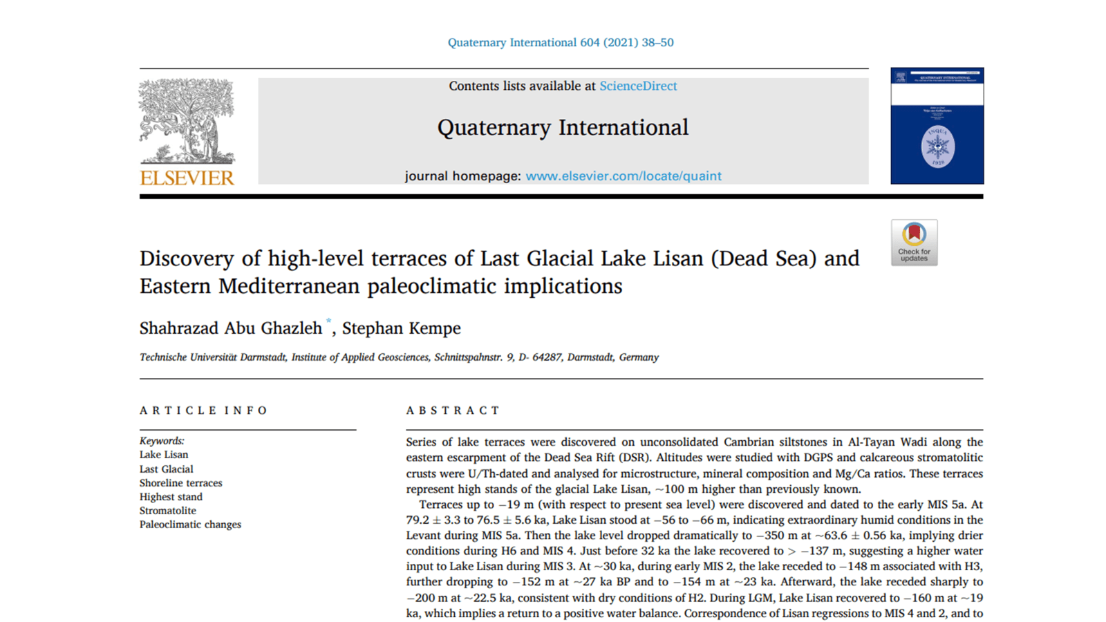 Abu Ghazleh, S., & Kempe, S. (2021). Discovery of high-level terraces of Last Glacial Lake Lisan (Dead Sea) and Eastern Mediterranean paleoclimatic implications. Quaternary International, 604, 38-50.