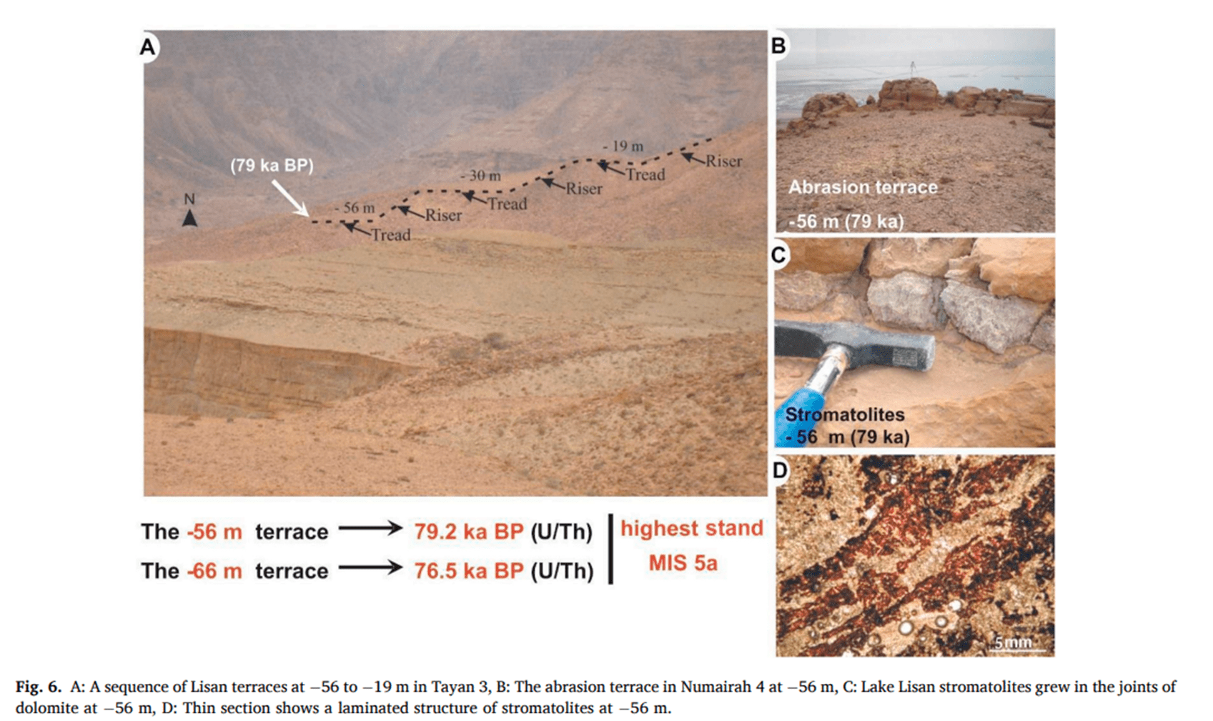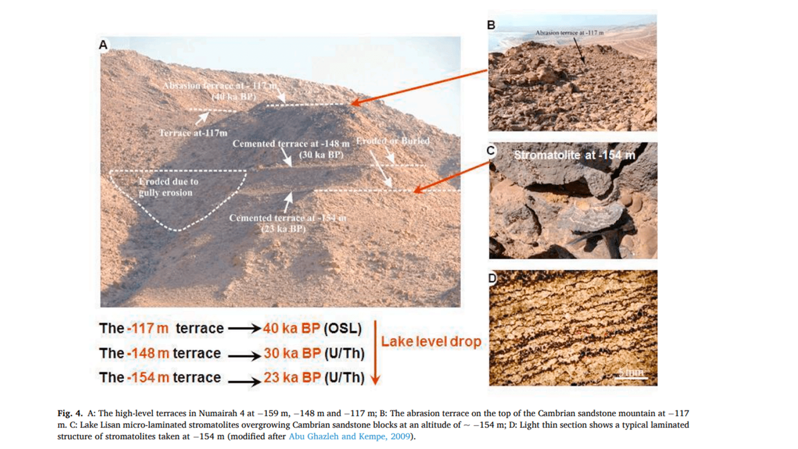 Let’s put some numbers to this. Abu Ghazleh and Kempe (2021) found stromatolites at elevations ranging from -1150 feet to -185 feet above sea level. U-Th dating of these stromatolites revealed ages spanning from about 80,000 to 19,000 years ago. That’s over 60,000 years of lake level fluctuations recorded in these rocky layers!