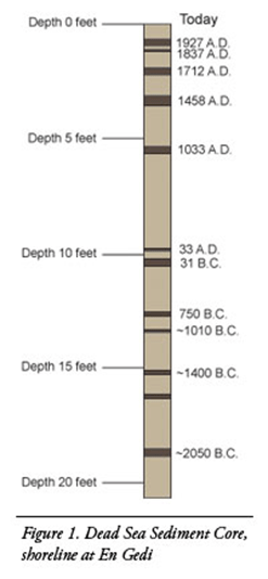 Recently, geologists have investigated the 4,000-year chronology of earthquake disturbances within the uppermost 19 feet of laminated sediment of the Dead Sea. Hypersaline waters preserve seasonally laminated sediment because organisms cannot live or burrow in the bed of the lake. As a result, only a nearby earthquake (or very large distant earthquake) can homogenize the lake’s uppermost sediment layers, producing a “mixed layer” devoid of laminations. A sketch of a sediment core from the west side of the Dead Sea appears in Figure 1. The sketch shows the depth of the “mixed layers” within the laminated sediment sequence. Two deeper mixed layers in the Dead Sea are datable from historical, archaeological, and geological associations with faulting—the earthquakes of 31 B.C. (the Qumran earthquake) and 750 B.C. (Amos’ earthquake). Other earthquakes are represented in the Dead Sea sediment core with dates approximated by assuming a steady rate of sedimentation.
