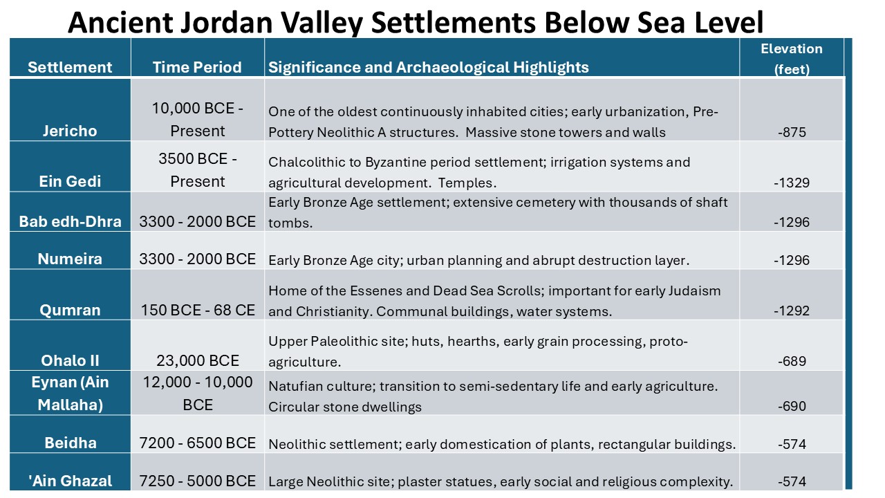 The archaeological evidence from Jericho challenges any notion that the city’s history could be compressed into just a few millennia. The depth of the archaeological layers, the sophistication of the structures, and the gradual changes in material culture all point to protracted history of human occupation at this location. It also places strict upper limits (-875 feet) on the upper most shoreline height of the Dead Sea during the lifetime of this city. This is critical for our goal of understanding the timetable and origins of the Dead Sea in relation to the scriptures.