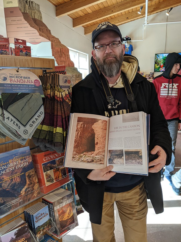 I’m holding a copy of the book “Grand Canyon: Monument to an Ancient Earth” in the Grand Canyon visitors center to one of the chapters that I contributed to the book.